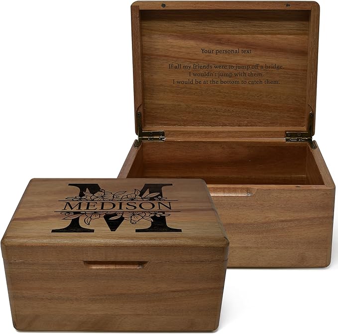• Materials: our engraved memorabilia box, crafted from premium acacia hardwood with smooth varnished surface, 100 degree premium metal hinges lock the lid in an upright position for more convenience. Our boxes are made from natural acacia wood, making each piece unique.